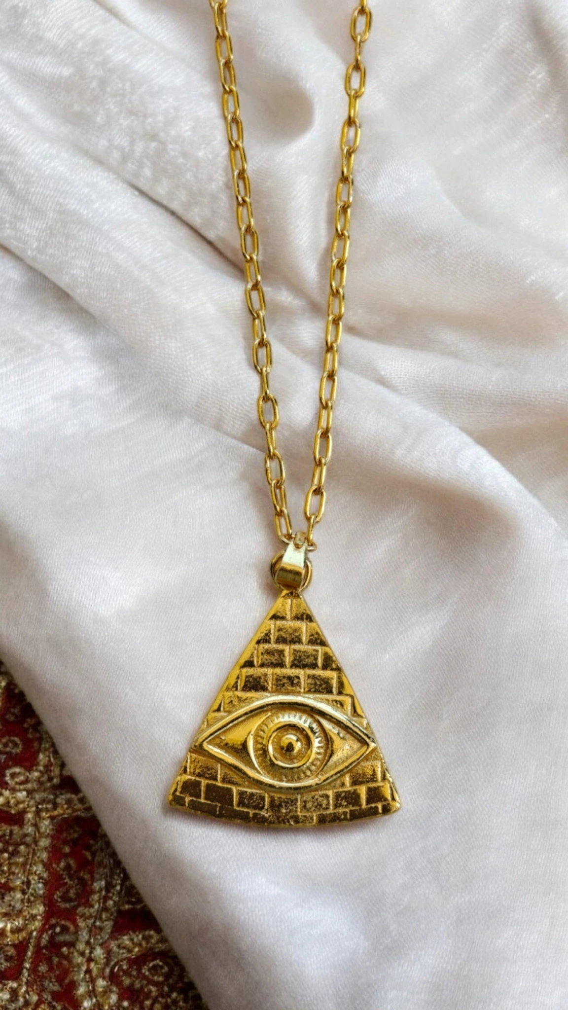 Elevate your style with our evil eye pyramid necklace. This unique piece features a striking pyramid design with a protective evil eye symbol. Bringing both aesthetic appeal and protection from negative energy